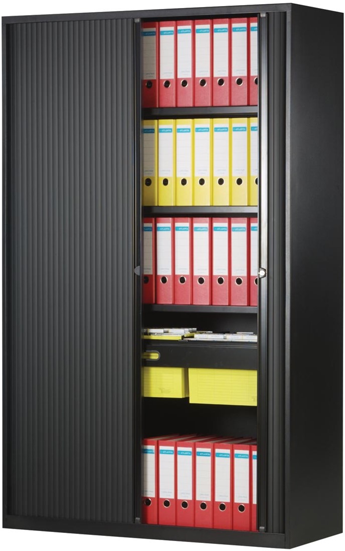 Artikelomschrijving Bisley roldeurkast, ft 198 x 120 x 43 cm (h x b x d), 4 legborden, zwart