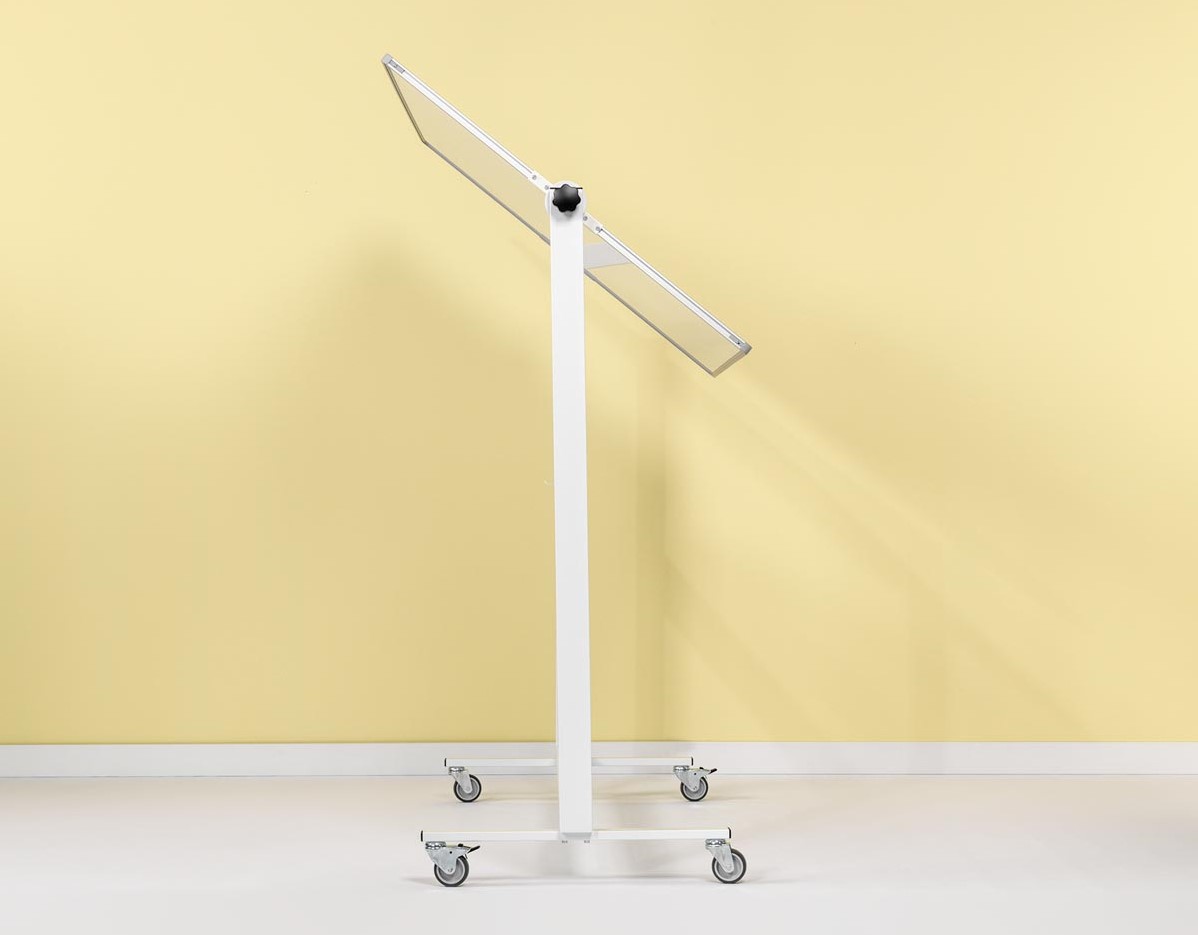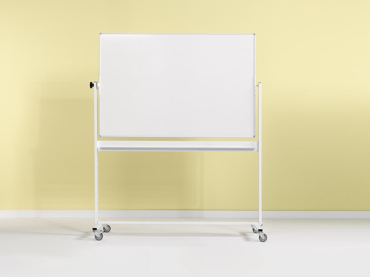 Geëmailleerd oppervlak. Dubbelzijdig, magnetisch en kantelbaar. Droog uitwisbaar. Aluminium frame. 4 wielen waarvan 2 met rem, gemakkelijk te verplaatsen en te draaien.