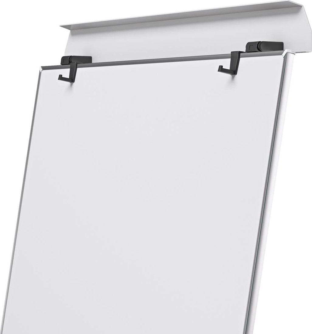 Magnetisch, droog uitwisbaar bord. Metalen opklapbare papierklem. Verstelbare haken. Metalen opklapbare pennengoot over de volle breedte. In 3 hoogtes verstelbaar: 175 tot 200 cm.