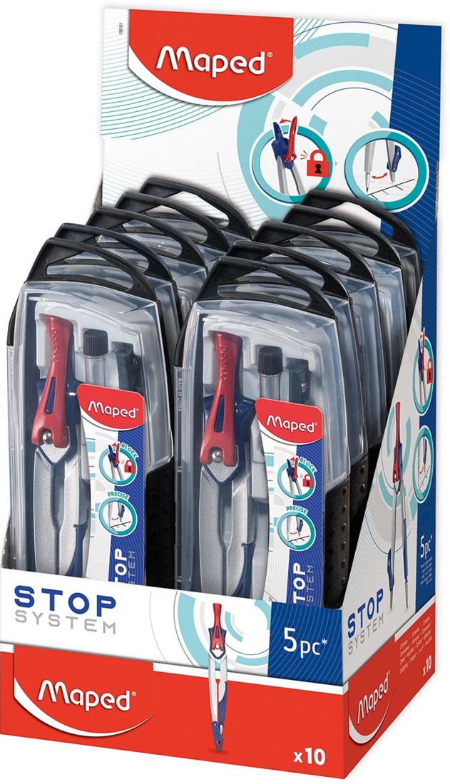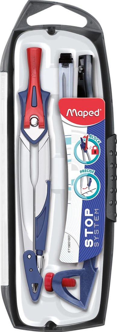 Artikelomschrijving Maped passer Stop System 5-delige passerdoos: 1 passer Stop System, 1 universeel inzetstuk, 1 mineslij...