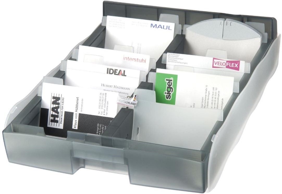Capaciteit: 2.000 visitekaartjes. Bij opening glijdt het deksel onder de fichebak. Mogelijkheid om het deksel te personaliseren. Geleverd met 8 verzetbare indexen en een alfabetische index (16 stuks). Ft 21,5 x 30 x 6,8 cm. Kleur: transparant grijs.