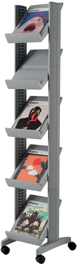 5 legborden. Plastic structuur met metalen versterking. Ft legbord 32,7 x 27,5 cm (h x b), rand: 4 cm. Verstelbaar elke 2 cm en op 0° - 45° - 75°. Met 4 zwenkwielen. Plat geleverd. Makkelijk te monteren, zonder benodigheden. Ft 167,5 x 35 x 38,5 cm (h x lx b).
