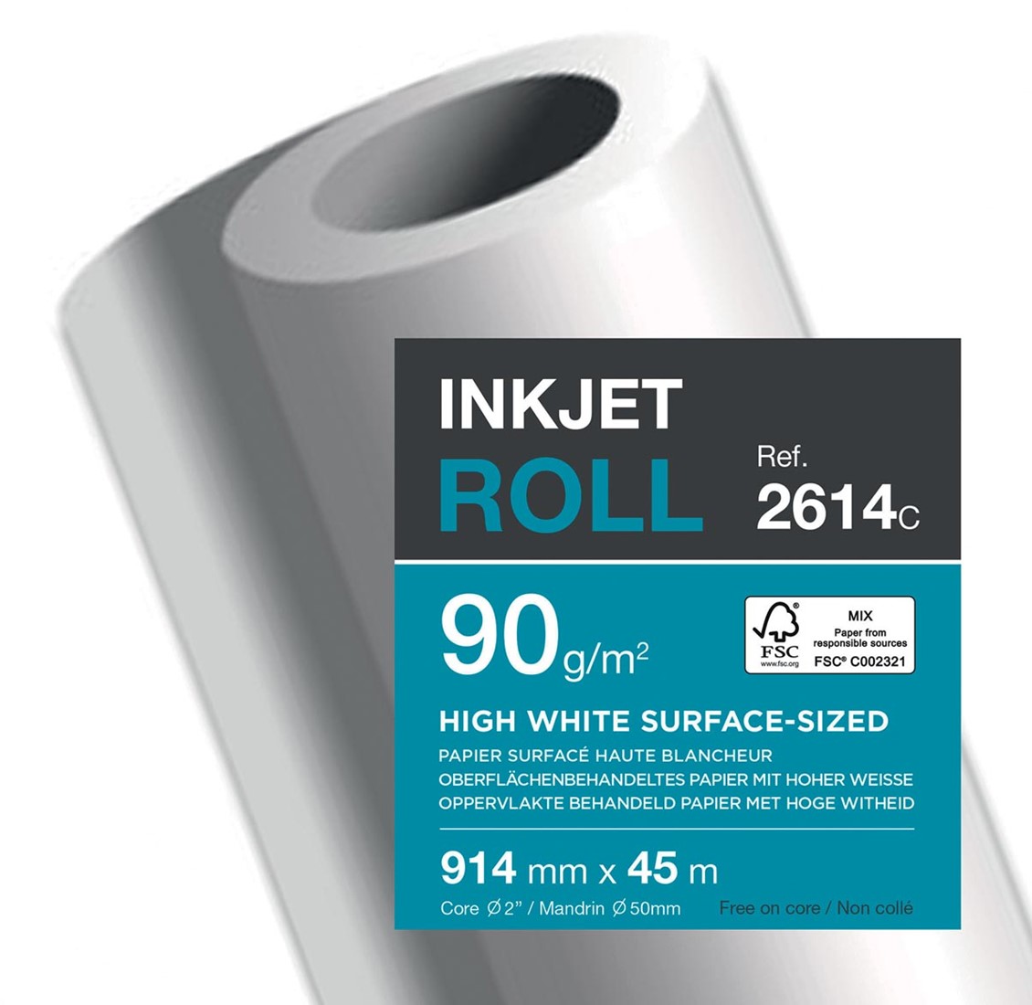 Papier van 90 g/m². Witheid: 162 CIE. Ultra wit, glanzend inkjetpapier. Ideaal voor scherpe kleurenafdrukken. Ft 914 mm x 45 m. Certificaat: FSC Mix