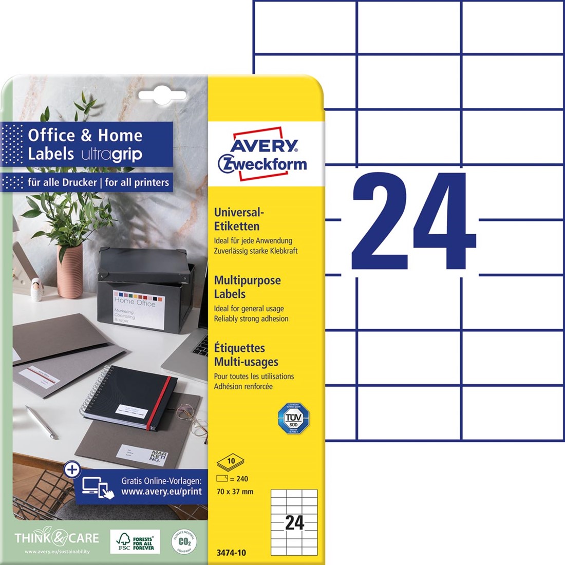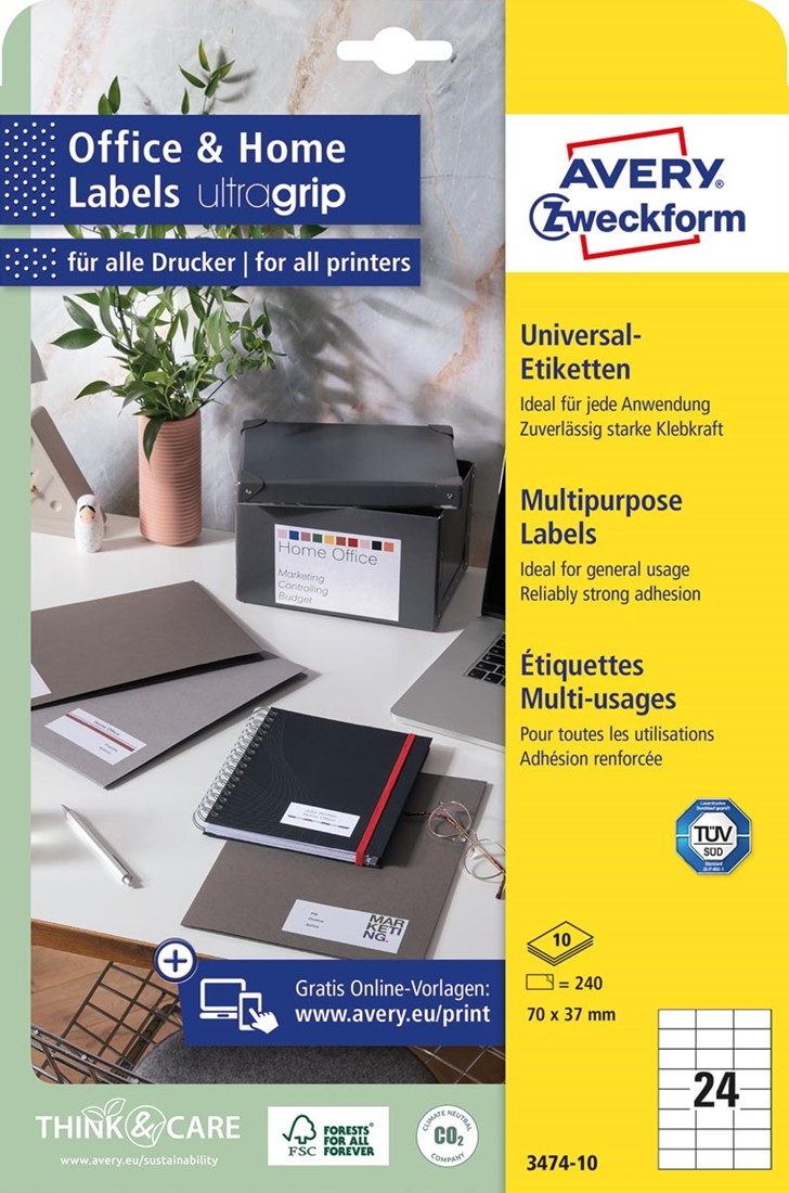 Artikelomschrijving Avery Zweckform universele etiketten, 70 x 37 mm, wit, permanent klevend, 240 etiketten, 10 vellen