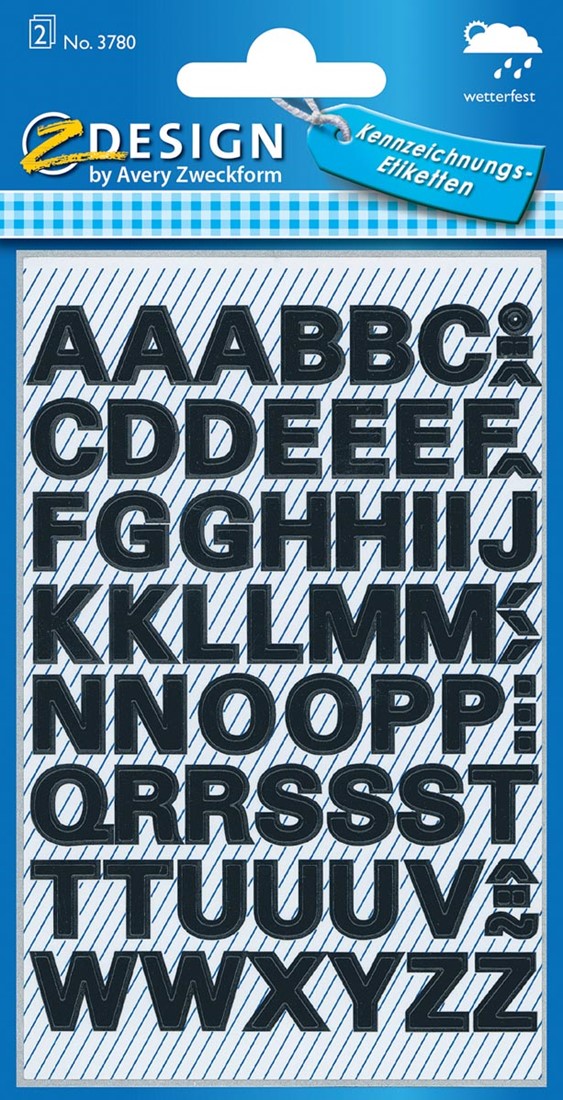Specificaties Avery Etiketten, letters A-Z, 2 blad, zwart, waterbestendige folie