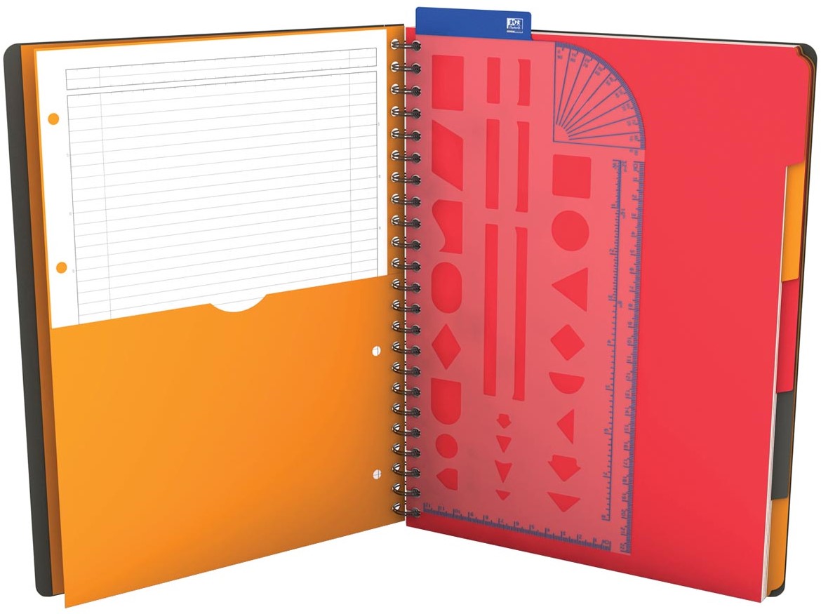 Ft 23,3 x 29,8 cm (A4+). Optik papier van 80 g/m². 160 uitscheurbare bladzijden (80 vel). 4-gaatsperforatie. Liniëring: gelijnd en geruit 5 mm. Met spiraalbinding. Met liniaal, 5 tabbladen, opbergvak. Stevige, harde kaft uit karton. Met scanfunctie. Compatible met Scribzee