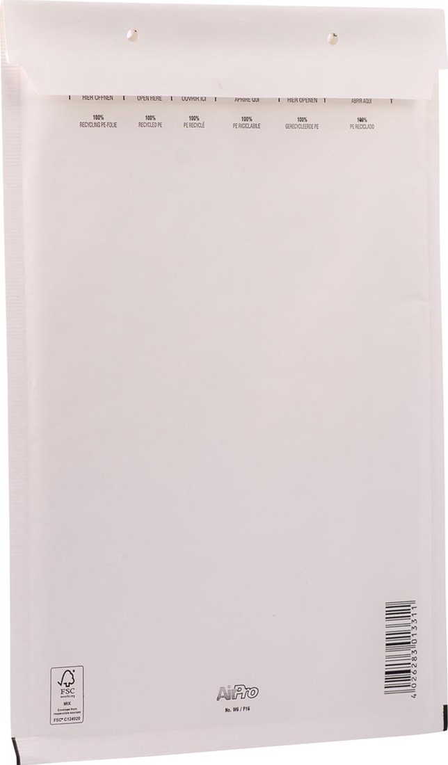 Uit wit kraftpapier van 80 g/m². Zonder venster. Met stripsluiting. Met luchtkussenfolie. FSC-gecertificeerd. Vermelde formaten zijn binnenformaten.
