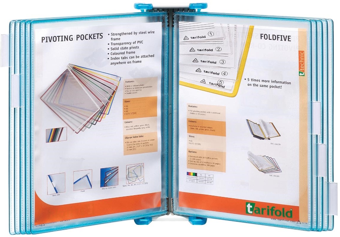 Voor ft A4. Muurkit met 10 transparante tassen en 5 ruiters van 50 mm. De pluggen laten een betere steun toe van de tassen en een vlottere lectuur. De elementen kunnen naar wens naast elkaar geplaatst worden. Tassen uit recycleerbare PP. Kleur: transparantblauw.