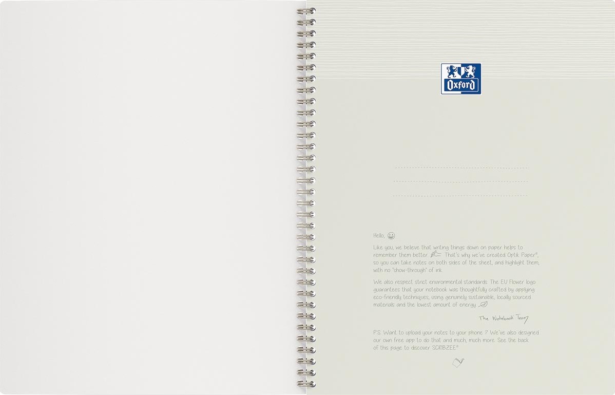 Ft 23 x 29,7 cm (A4+). Optik papier van 90 g/m². 140 bladzijden (70 vel). Soepele kartonnen kaft met een krasbestendige matte afwerking en ronde hoeken. Dubbelspiraal om 360 graden open te leggen. Met uitscheurbare vellen. Met scanfunctie. Compatibel met Scribzee App. Certificaat: EU Ecolabel