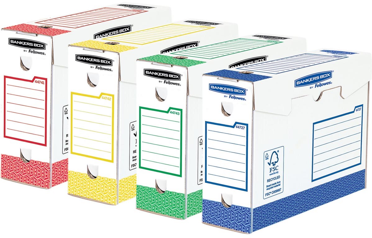 Artikelomschrijving Bankers Box basic archiefdoos heavy duty, ft 9,5 x 24,5 x 33 cm, geassorteerde kleuren, pak van 8 stuks