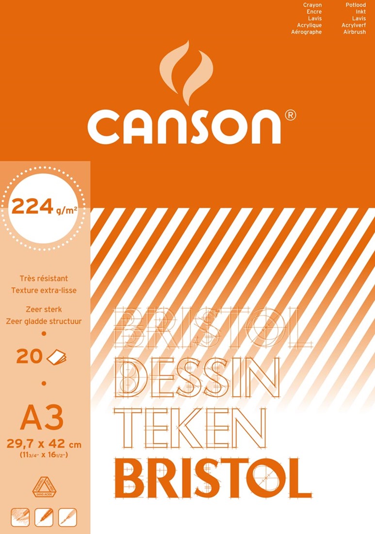 Canson tekenpapier Bristol, 224 g, ft 21 x 29,7 cm, A4, blok van 20 vel