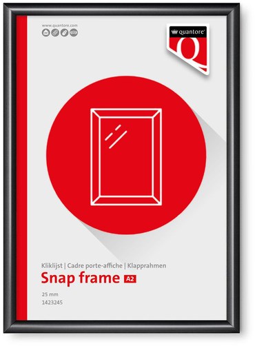 De zwarte kliklijst van Quantore A2 is uitermate geschikt om informatie, aanplakbiljetten of posters professioneel te presenteren. Dankzij de verborgen montagegaten blijft deze lijst zijn elegante uitstraling behouden wanneer deze eenmaal hangt. Het hiervoor bedoelde bevestigingsmateriaal wordt erbij geleverd en de lijst kan hiermee zowel staand als liggend opgehangen worden. Het aluminium frame zorgt voor stevigheid en ziet er tevens modern uit. De posters worden in de kliklijst beschermd door de bijgeleverde transparante, ontspiegelende folie.