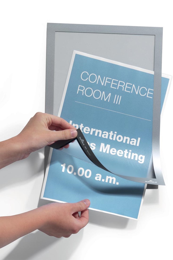 Zelfklevend kader, bestaande uit twee transparante folies die samen worden gehouden door de magnetische rand. Dankzij de magnetische rand kan de gegeven informatie gemakkelijk worden vervangen. Kleeft op alle oppervlakken met een vlakke ondergrond. Herpositioneerbaar. Toepassingen: deurborden, signalisatie en aanbiedingen. Leesbaar van beide zijden bij bevestiging op glas. Zelfde kleur van de rand aan voor- en achterzijde. Kan zowel in staand als liggend formaat worden gebruikt