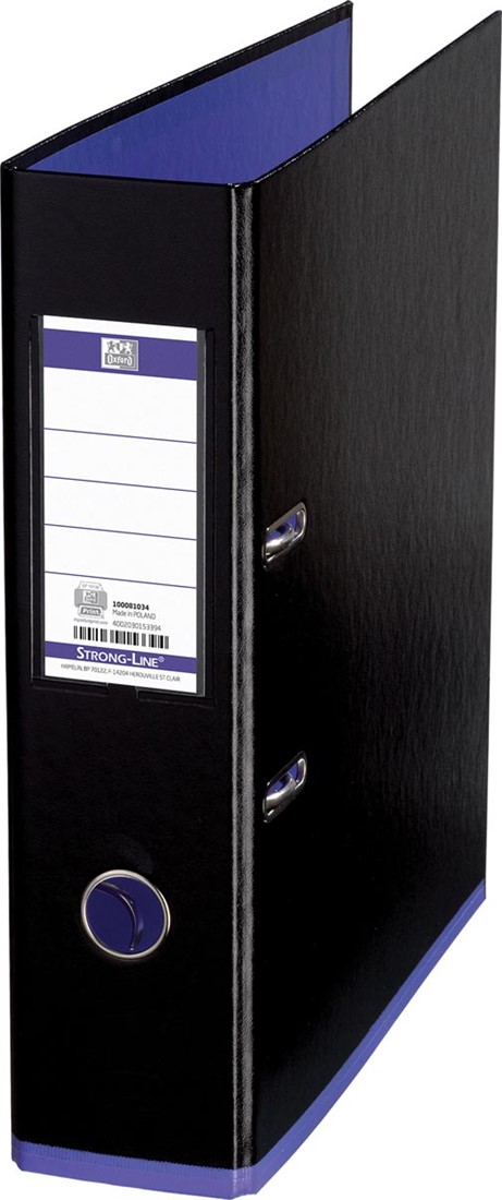 Voor ft A4. Rug van 8 cm. Uit extra stevig karton, binnen- en buitenzijde met bicolour PP-folie overtrokken waardoor de ordner vuil- en waterafstotend is. Met hefboommechanisme en neerhouder. Met Strongline randbescherming die krassen op meubilair voorkomt, grijpgat, radosleuven en insteekrugetiket.