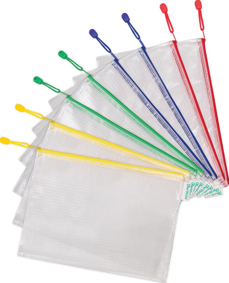 Opbergtas uit transparante PVC. Ritssluiting in hetzelfde kleur als het bandje van de tas. Perfect voor het beschermen en opbergen van jouw documenten, stalen, magazines, kranten, schoolartikelen, ... Pak van 8 stuks in geassorteerde kleuren: geel, rood, groen en blauw.