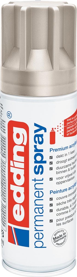 Weg met verfblikken en kwasten! Met de hoogwaardige acryllakken van Edding kunnen vrijwel alle oppervlakken snel en eenvoudig worden gerenoveerd, gerestaureerd en creatief gedecoreerd. Eigenschappen: Dekt meteen, eenmaal spuiten en onmiddellijk een perfect resultaat Extreem sneldrogend: stofdroog na 1-3 minuten, handdroog na 10 minuten en volledig droog na 30 minuten Economisch: 200 ml is voldoende voor 0,7-1 m² Duurzaam: zowel binnen als buiten. Kras-, stoot- en slagvast, lichtvast en kleurbestendig dankzij de hoge oppervlaktehardheid Voor vrijwel alle oppervlakken geschikt Opvallend intensief en gelijkmatig lakresultaat. Handige 200 ml spuitbus, geringe spuitnevel dankzij uitgebalanceerd druksysteem 100 % vrij van zware metalen