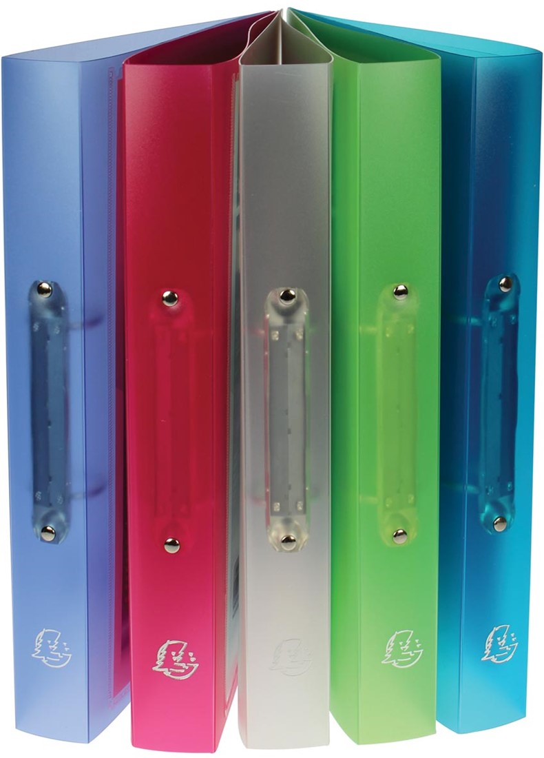 uit doorschijnende PP 7/10e, met 2 ringen, halfharde kaft, geassorteerde kleuren: transparant, rood, paars, groen en blauw
