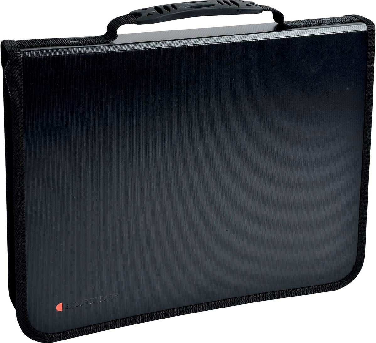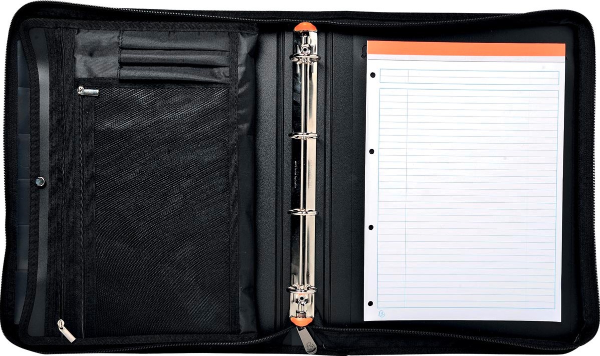 Uit stevige PP. Voorzien van plaats voor notablok ft A4 of schrift, visitekaarten, pennenhoes en vakken voor het klasseren van losse documenten. Met 4 ringen. Met handvat en volledige ritssluiting. Met verstevigd vak voor tablet. Kleur: zwart. Ft 27 x 36 cm.