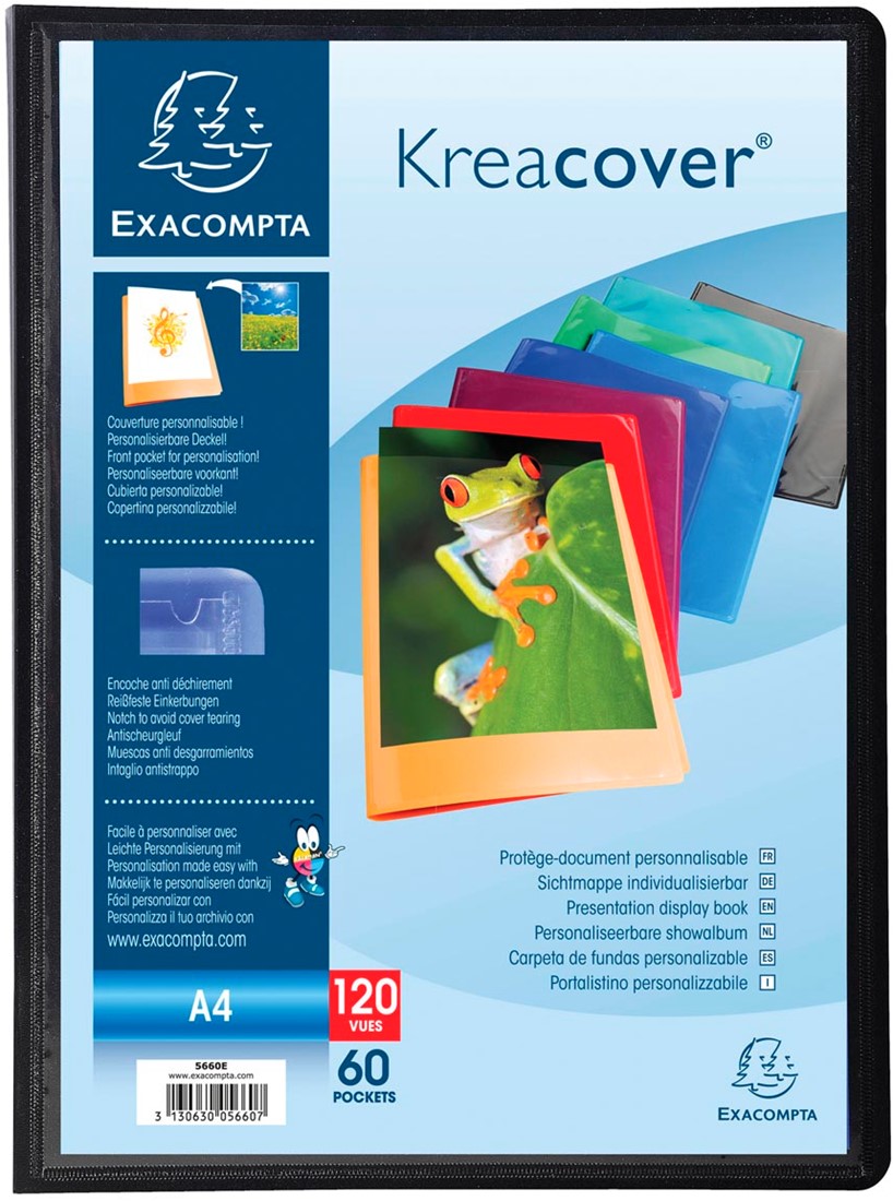 Voor ft A4 (24 x 32 cm). Personaliseerbaar met Kreaman via www.exacompta.com. Kaft uit ondoorschijnend stevig PP 5/10e. Doorschijnende tassen.