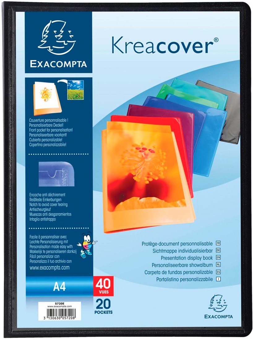 Voor ft A4 (24 x 32 cm). Personaliseerbaar met Kreaman via www.exacompta.com. Kaft uit ondoorschijnend stevig PP 5/10e. Doorschijnende tassen.