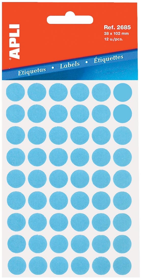 Stel een vraag over Apli ronde etiketten in etui diameter 13 mm, blauw, 175 stuks, 35 per blad (2056)