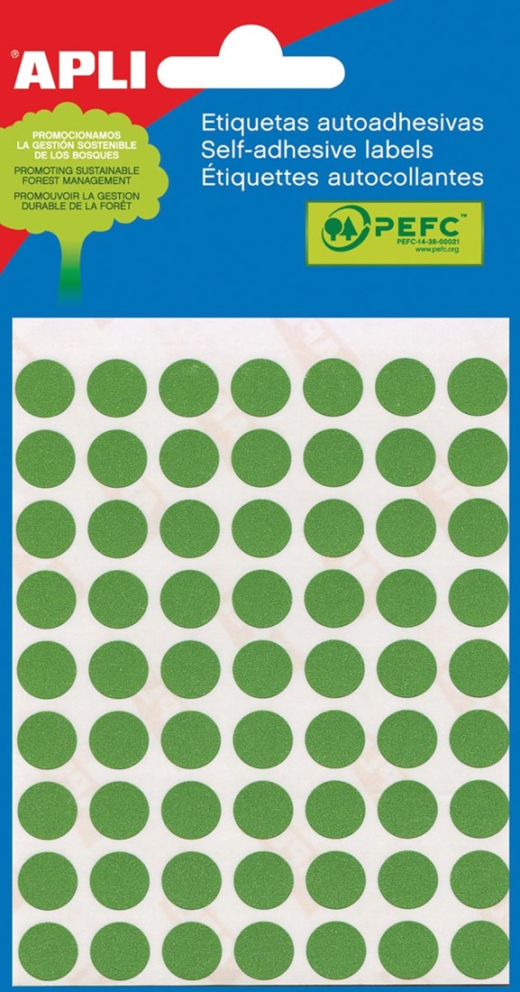 Stel een vraag over Apli ronde etiketten in etui diameter 8 mm, groen, 288 stuks, 96 per blad (2047)