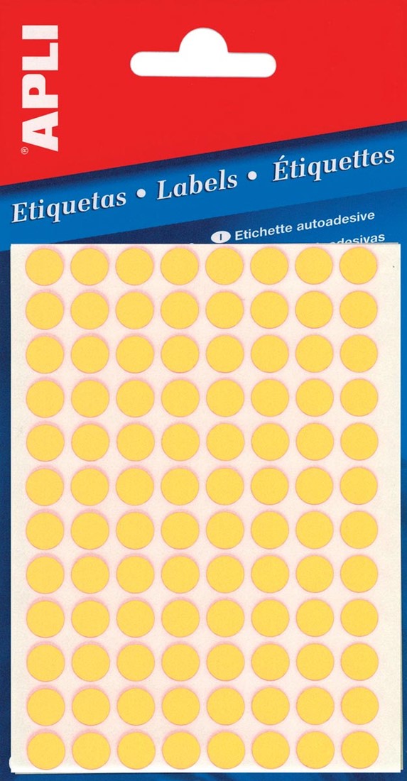 Specificaties Apli ronde etiketten in etui diameter 8 mm, fluo geel, 288 stuks, 96 per blad (2079)