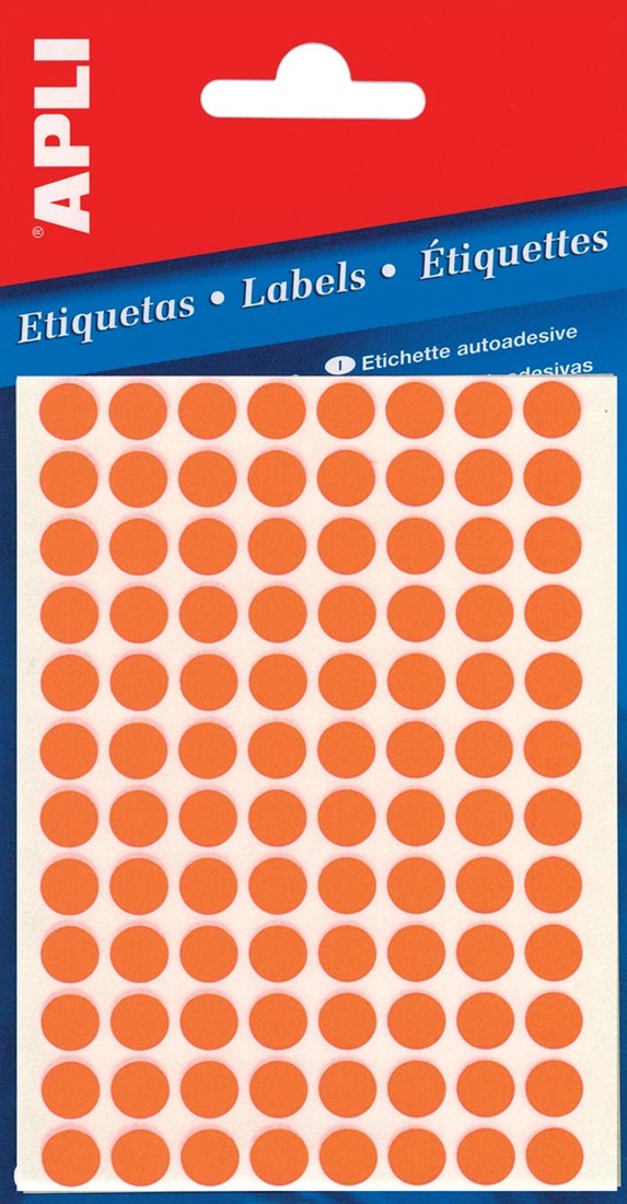 Specificaties Apli ronde etiketten in etui diameter 8 mm, fluo oranje, 288 stuks, 96 per blad (2080)