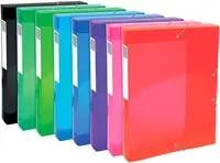 Voor ft A4 (25 x 33 cm). Uit halfdoorschijnende PP 7/10e. Met elastosluiting. Met rugetiket. Geassorteerde kleuren: roze, rood, paars, lichtgroen, donkergroen, lichtblauw, donkerblauw en zwart.