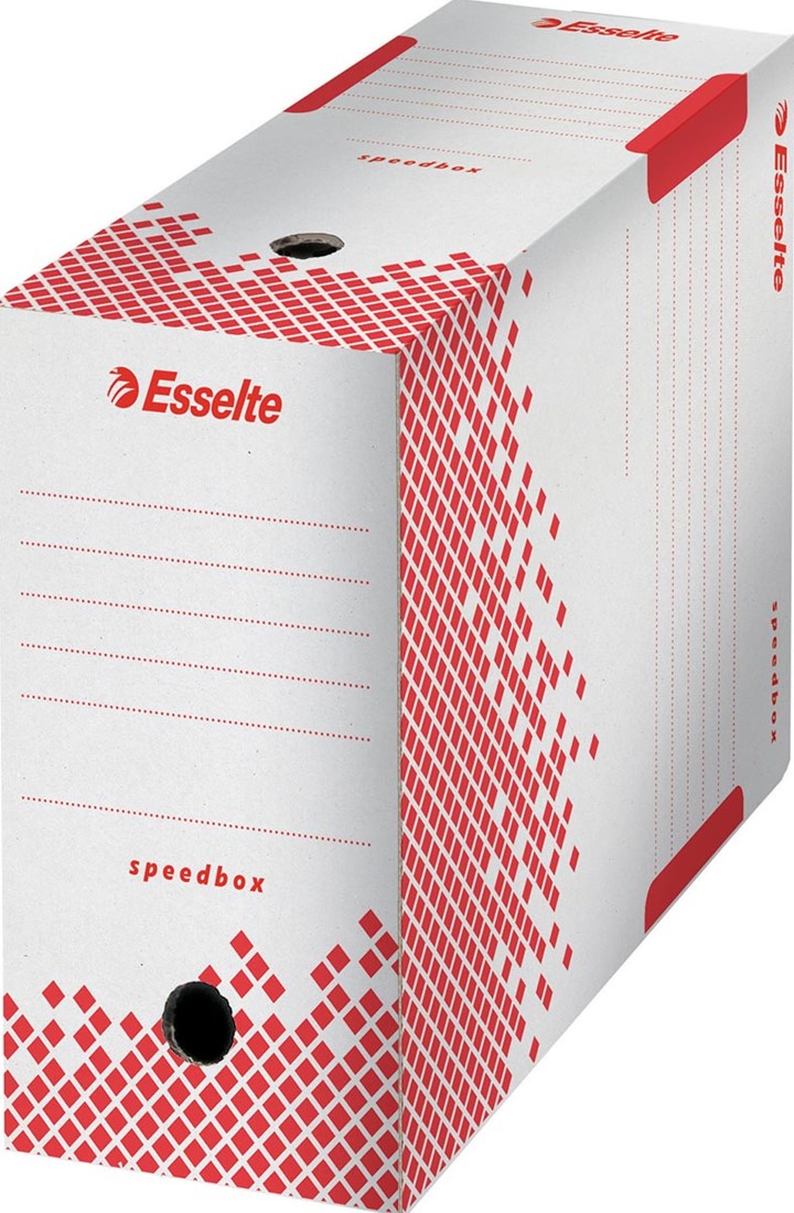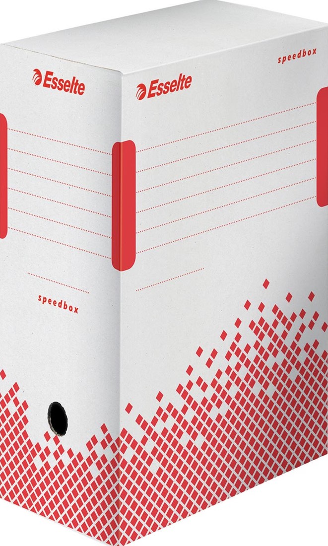 Esselte Speedbox archiefdoos 100. Speedbox bespaart u tijd en moeite. In slechts één snelle handeling klaar voor het archiveren van documenten. Eenvoudig en intuïtief te monteren. Geen handleidingen nodig. Automatische montage. Dubbel sluitende kleppen voorkomen dat de archiefdoos zich opent en versterken het duimgat. Voor A4 en folio formaat. Uit wit karton. 100% gerecycleerd en 100% recycleerbaar. FSC Mix gecertificeerd.