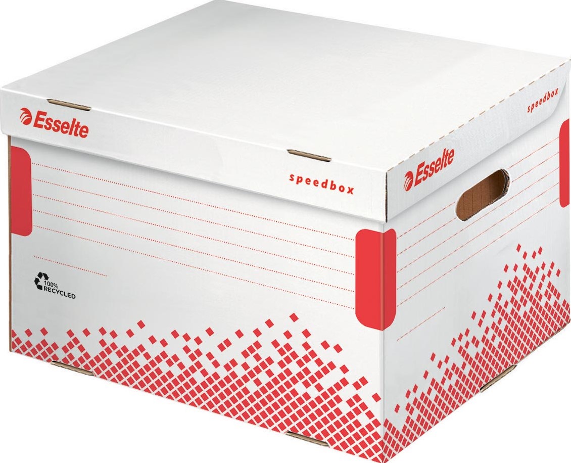 Esselte Speedbox opberg- en transportdoos. Speedbox bespaart u tijd en moeite. In slechts drie snelle handelingen klaar voor het archiveren van documenten. Eenvoudig en intuïtief te monteren. Geen handleidingen nodig. Automatische montage. Met geïntegreerddeksel. Uit wit karton. 100% gerecycleerd en 100% recycleerbaar. Automatische montage. FSC Mix gecertificeerd.