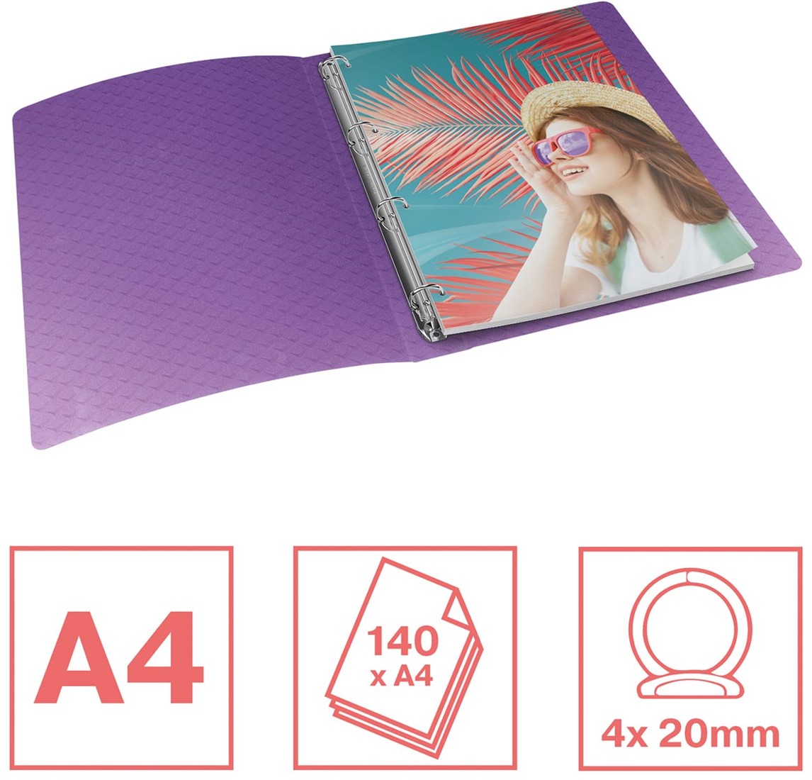 Voor ft A4 (24,8 x 31,4 cm) Rug van 2,5 mm Uit PP met motief Met ronde ringen Met soepele kaft Met rugetiket Capaciteit: 140 vel
