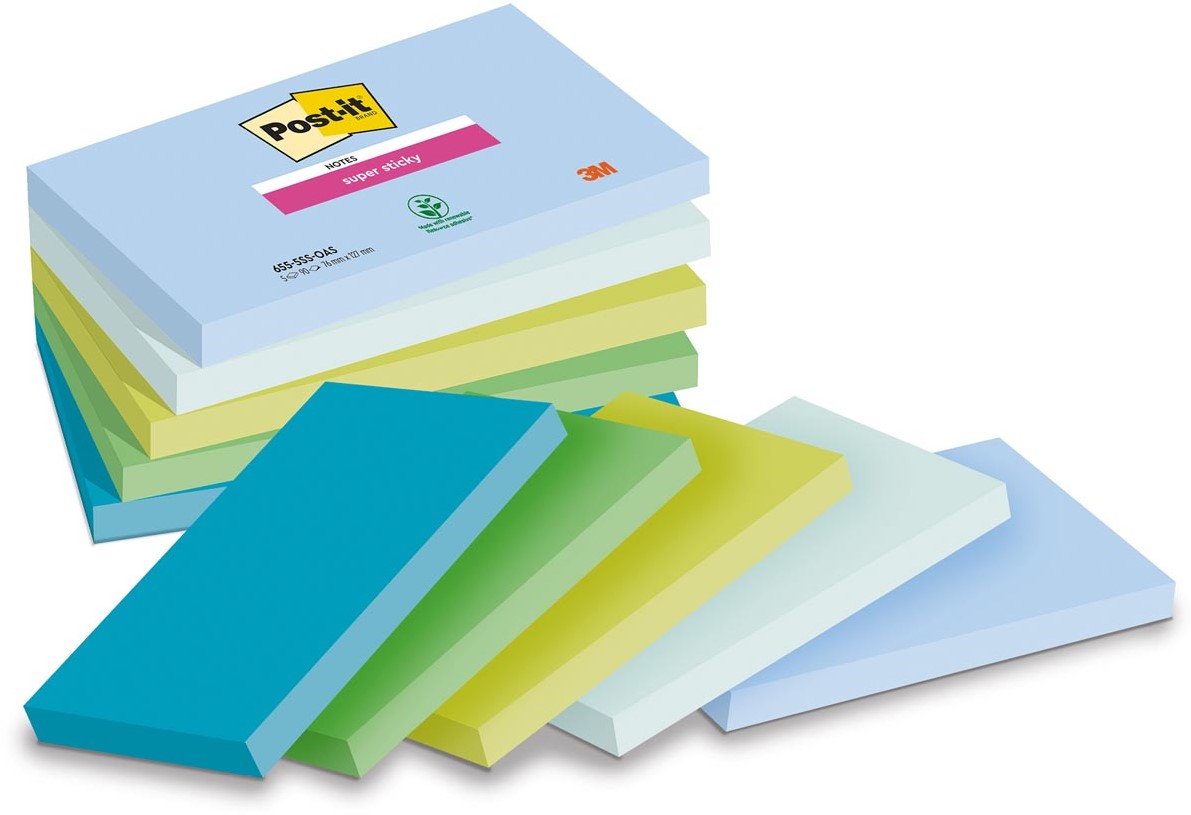 Artikelomschrijving Post-it Super Sticky notes Oasis, 90 vel, ft 76 x 127 mm, geassorteerde kleuren, pak van 5 blokken