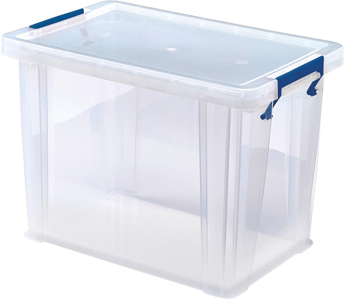 Artikelomschrijving Bankers Box opbergdoos 18,5 liter, transparant met blauwe handvaten, per stuk verpakt in karton