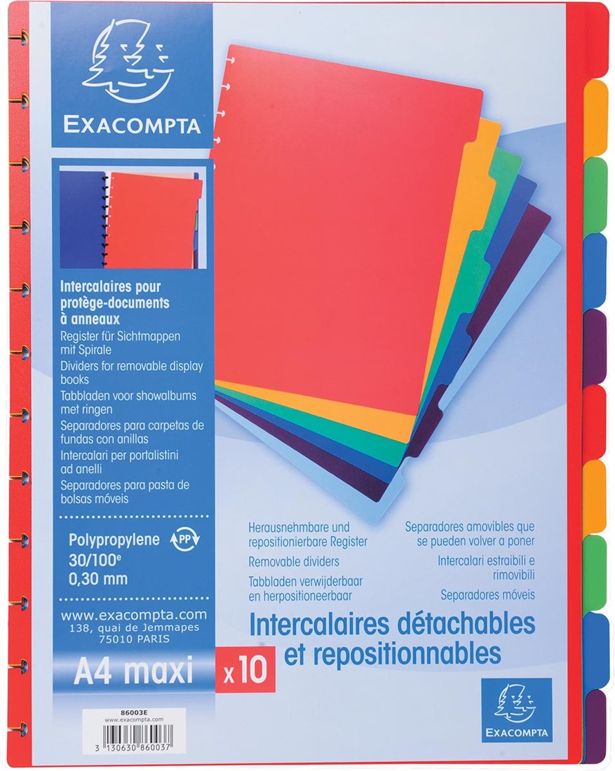 Artikelomschrijving Exacompta uitneembare tabbladen voor showalbum met ringen, in gekleurd PP, 10 tabs