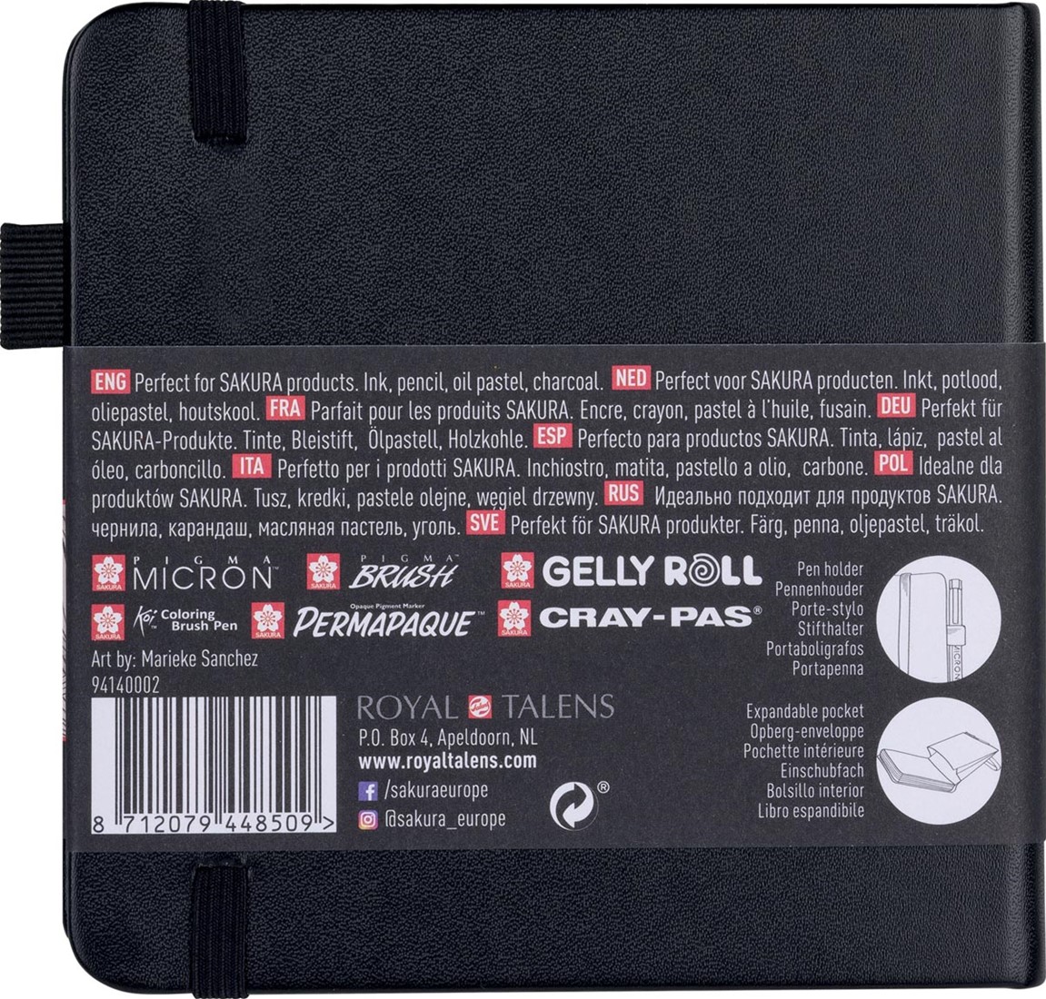 Papier van 140 g/m². Zuurvrij. Blok van 80 vel. Voor potlood, inkt, (gel)pen, fineliner, marker, oliepastel en houtskool. Met penhouder, een uitvouwbare envelop, een elastisch sluitbandje en een uniek geïllustreerde slip-over-kaft.