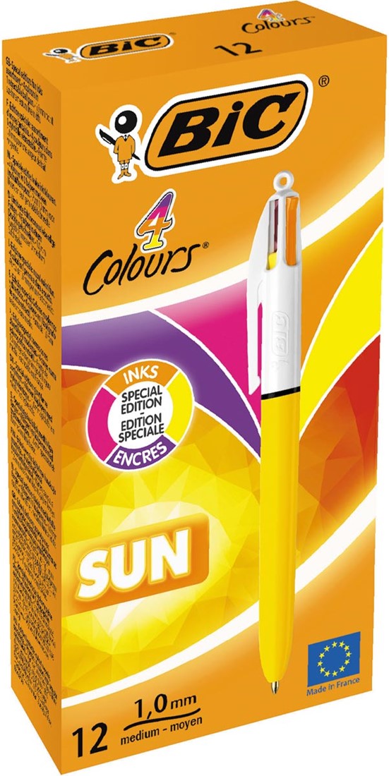 Stel een vraag over Bic Colours Sun 4-kleurenbalpen, medium, fashion inktkleuren, lichaam geel