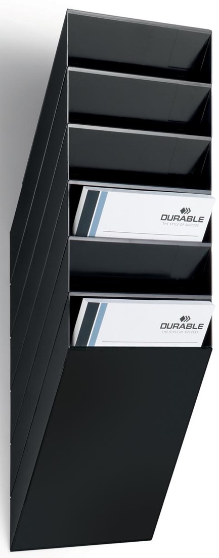 Folderhouder in een eenvoudig design om informatie op A4-formaat voor te stellen en aan te bieden. Met 6 verticale verdelingen. Ft 69,2 x 24 x 13,5 cm (h x b x d). Kleur: zwart.