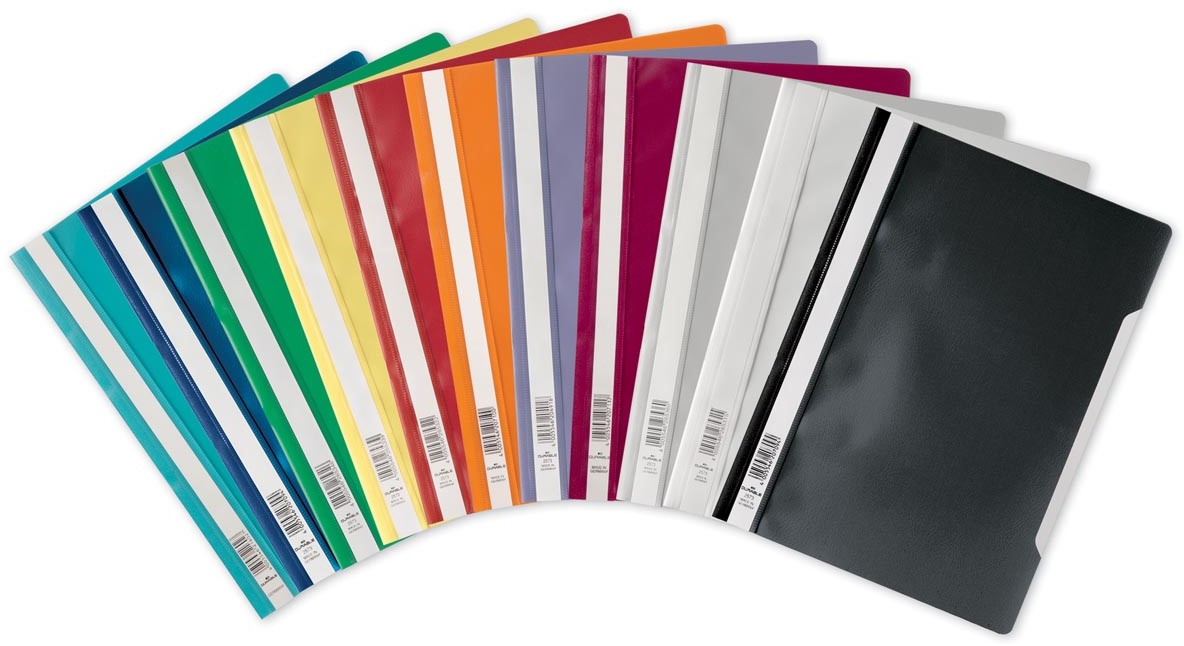 Map van standaard kwaliteit met doorzichtige voorzijde. Zichtsnelhechtmappen van DURABLE zijn ontworpen voor uiteenlopende toepassingen, zoals rapporten, offertes, notities en opslag van documenten. Ruime kleurkeuze en etiketteringsmogelijkheden. Kan worden uitgerust met een ordnerhechter (art.nr. 2996), om op te bergen in ringmappen. Specificaties: Voor ft A4 Uit PP Met transparant voorblad en etiketvenster over de gehele lengte Uitsnijding in de voorzijde om gemakkelijk te kunnen bladeren 100 %recycleerbaar