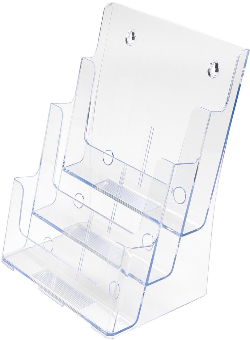 Toon een assortiment folders in één enkel meubel. Kan ook aan de muur bevestigd worden. Gekanteld voor een optimale zichtbaarheid. Uit transparante polystyreen.