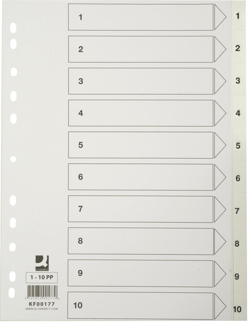 Artikelomschrijving Q-CONNECT tabbladen, A4, PP, 11-gaatsperforatie,met indexblad, set van 1-10, wit