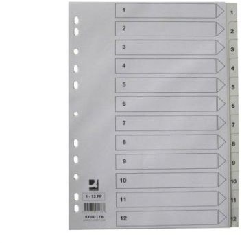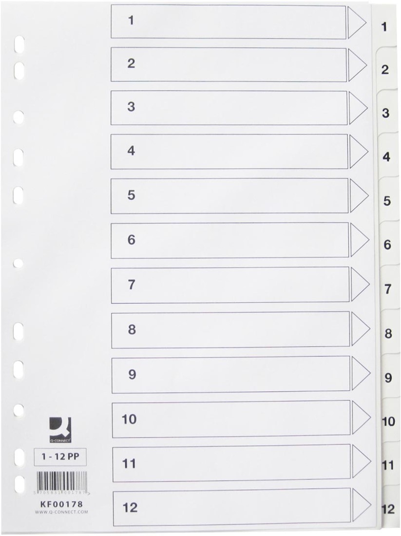 Artikelomschrijving Q-CONNECT tabbladen, A4, PP, 11-gaatsperforatie, met indexblad, set van 1-12, wit