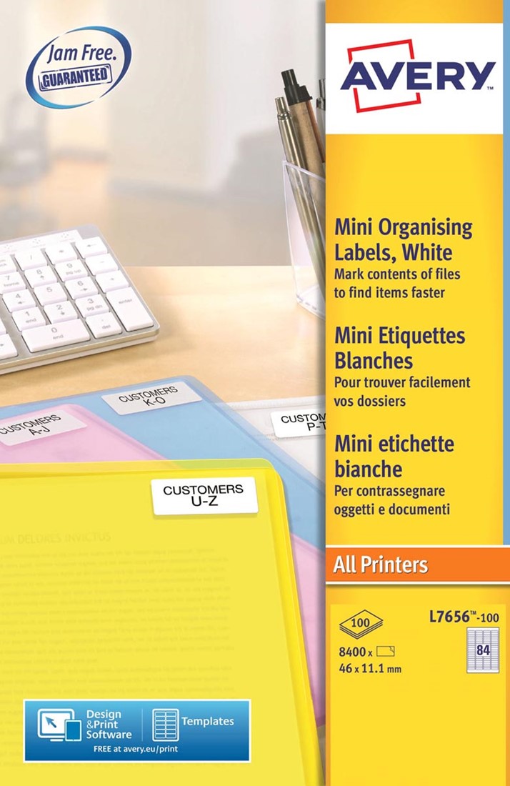 Artikelomschrijving Avery L7656-100 mini etiketten ft 46 x 11,1 mm (b x h), wit, doos 8400 stuks
