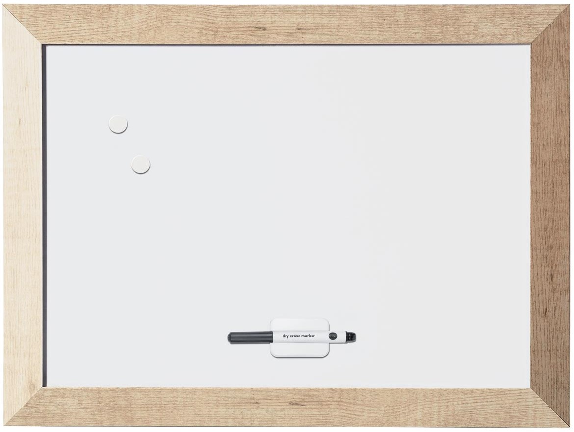 Ft 60 x 45 cm. Magnetisch, droog uitwisbaar oppervlak. Met elegant en robuust houten frame. Inclusief monteerset, 2 magneten, bordwisser en whiteboardmarker.