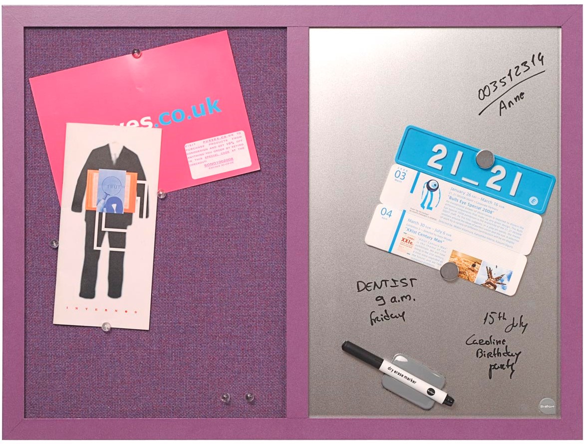 Ft 60 x 45 cm. Combinatiebord met op de ene helft textiel en op de andere helft een magnetisch notitiebord. Inclusief bevestigingsmateriaal en push pins.