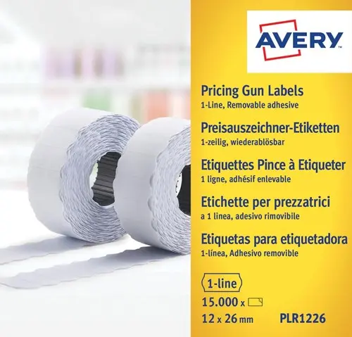 Artikelomschrijving Avery PLR1226 etiketten voor prijstang afneembaar, ft 12 x 26 mm, 15 000 etiketten, wit