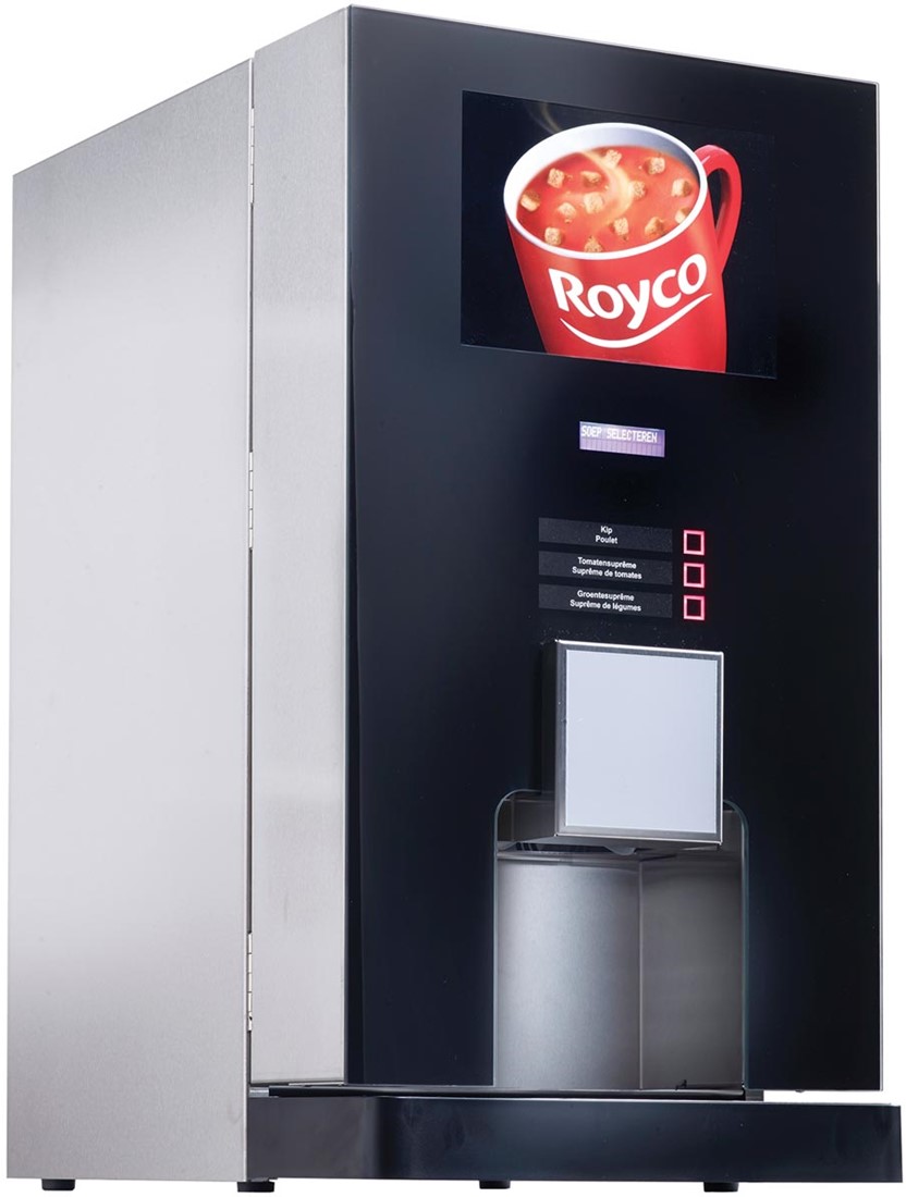 Met de Royco automaat Q_Line kan je op elk moment van de dag genieten van een welverdiende pauze! Deze soepautomaat is eenvoudig in gebruik en onderhoud. In onze Royco automaat is plaats voorzien voor 3 heerlijke Royco-soepjes. Je kan je keuze maken uit deze Royco-toppers : Tomatensuprême, Kip, Pompoensuprême, Groentesuprême, St. Germain en Curry. Een simpele druk op de knop en de Royco automaat maakt je favoriete soepje klaar. Van efficiënt pauzeren gesproken. Bovendien kan de Q_Line worden uitgebreid meteen betaalsysteem. Geschikt voor een gebruik vanaf ongeveer 10 soepjes per dag. WATERLEIDING DIENT VOORZIEN TE ZIJN VOOR PLAATSING VAN HET TOESTEL. Het toestel wordt ook aangeraden voor bedrijven van +/- 25 werknemers of bedrijven die veel bezoekers hebben... Dit vooral wegens mogelijkheid van het verstrijken van de vervaldatum van het poeder en verstoppingen van leidingen wegens te weinig gebruik. *Deze automaat kan niet worden aangekocht. Het toestel komt bij u in bruikleen. Dit zijn de voorwaarden om van deze bruikleen te genieten: -Bij het plaatsen van de bestelling van de automaat dient u minstens drie automaat-soepen bij te bestellen. -Ook uw toekomstige bestellingen van automaat-soepen gebeuren via ons. Royco zal met de klant contactopnemen om na te gaan of aan de voorwaarden voldaan wordt en of het jaarlijks verbruik groot genoeg is om het toestel te installeren. Gelieve er rekening mee te houden dat de Royco automaat pas kan geplaatst worden wanneer de soep effectief aanwezig is. Om die reden verzoeken we u om een seintje te geven op het moment dat de soep werd geleverd. Vanaf dan zal er contac