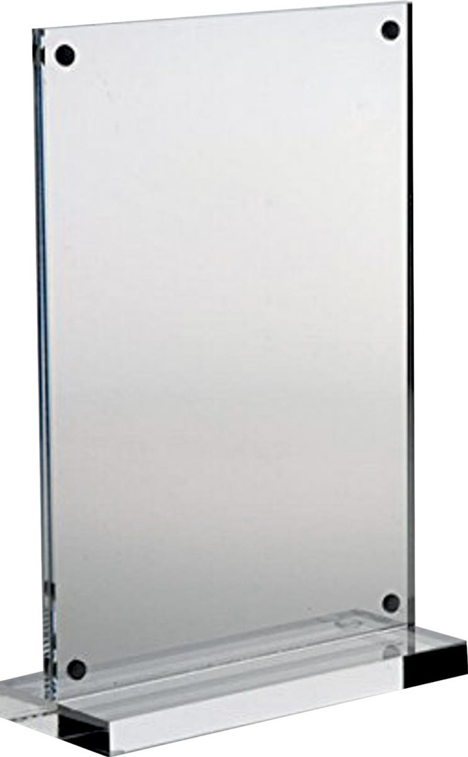 Display uit PMMA (2 x 3 mm) met een magnetisch systeem. Geschikt voor het presenteren van menukaarten, drankkaarten, brochures, enz. In T-vorm met een rechthoekige basis waarop de houder is vastgehecht.Makkelijk in elkaar te steken dankzij de magnetische sluiting.
