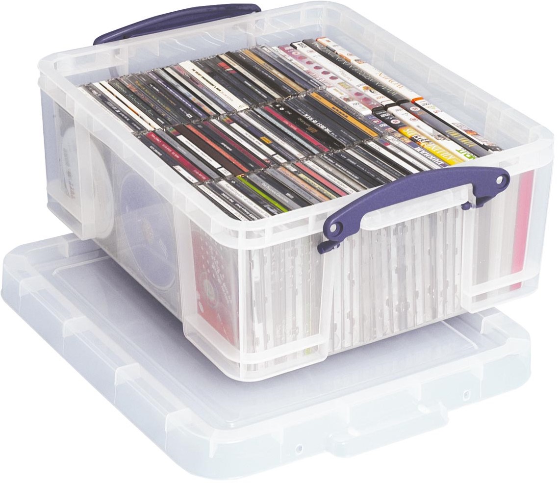 Opbergdoos uit sterke, transparante kunststof. Deksel afsluitbaar met 2 clips, waardoor de inhoud beschermd wordt tegen stof en vuil. Perfect stapelbaar met of zonder deksel. Volledig platte en versterkte bodem.Voor 93 CD's of 44 DVD's. Buitenft: 48 x 39x 20 cm (l x b x h) Binnenft: 39,5 x 33,5 x 17 cm (l x b x h) Inhoud: 18 liter