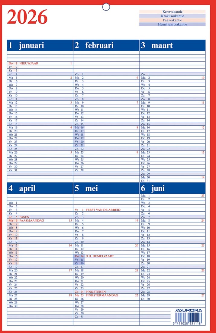 Gekartonneerde 1.000 g/m² plannings- en wandkalender 2-kleurendruk 1 versterkt gaatje Met schoolvakanties Ft 210 x 330